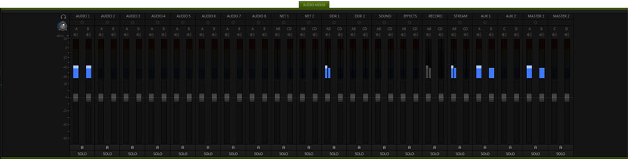 | Audio Mixing | Integrated multi-channel audio mixer for internal and external audio sources, outputs, stream and headphones, with 4 fully independent stereo output mixes: 2 Master, 2 AUX
