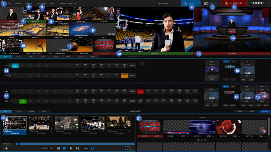 Our 24-channel switching system is just the start. TriCaster 860 gives producers instant access to even more content in real time, without adding equipment or crew. 10 still buffers and 5 animation buffers provide 15 bonus "always on" sources. And enhanced network inputs support cloud video, streaming servers, remote cameras, remotely hosted clips, USB cameras and more, dramatically expanding content and programming possibilities without taking up a hardware input.