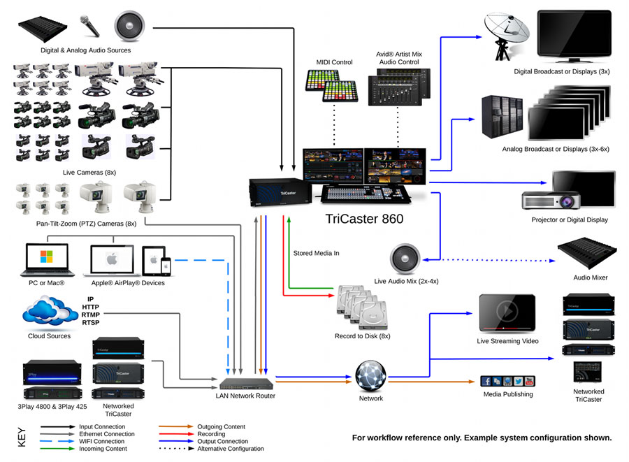 TriCaster 860 provides connectivity to prepare for any location scenario. Connect multiple cameras (up to 8) with the capability to mix and match connection types, including SDI, component, composite and Y/C; and even camera types with varying SD and HD resolutions and formats. Equally flexible outputs can send a variety of feeds to multiple destinations and displays—even send a signal to another TriCaster over the network with a network output.